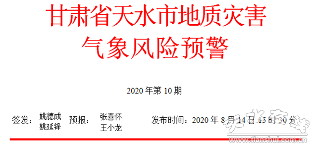 天水市自然資源局與天水市氣象局8月14日15時(shí)30分聯(lián)合發(fā)布地質(zhì)災(zāi)害Ⅰ級(jí)(紅色)氣象風(fēng)險(xiǎn)預(yù)警: