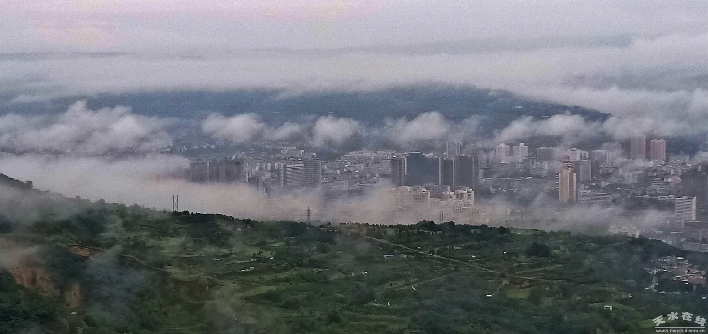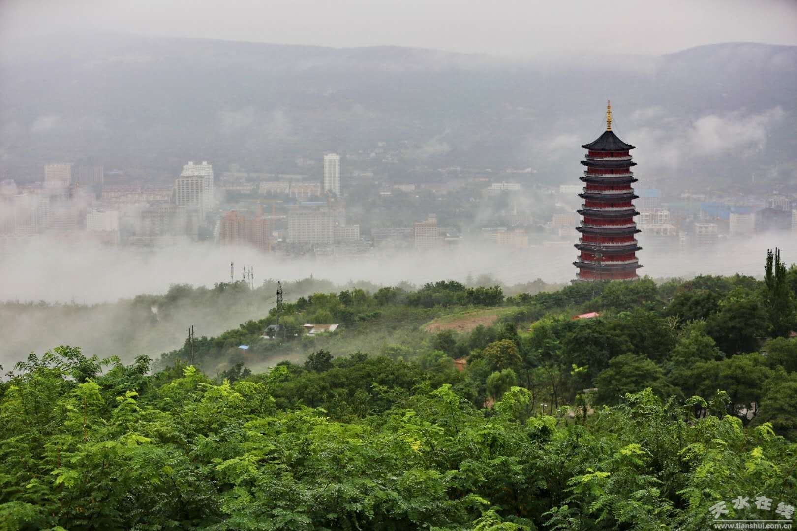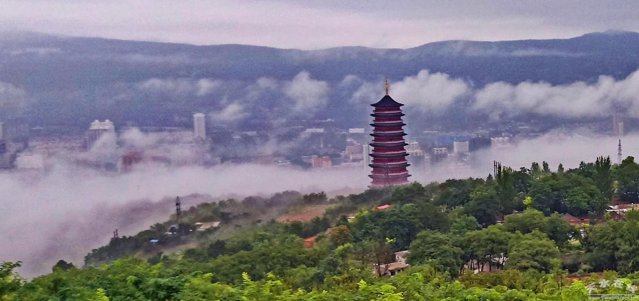 自8月14日上午開始,天水市出現(xiàn)大范圍降水天氣,截止16日07時,全市普降大到暴雨。16日上午7時左右,大雨中的天水,云霧彌漫,宛若仙境。(楊彥東8月16日上午7時攝于南郭寺大景區(qū))