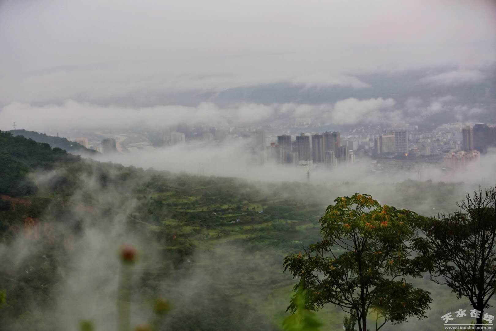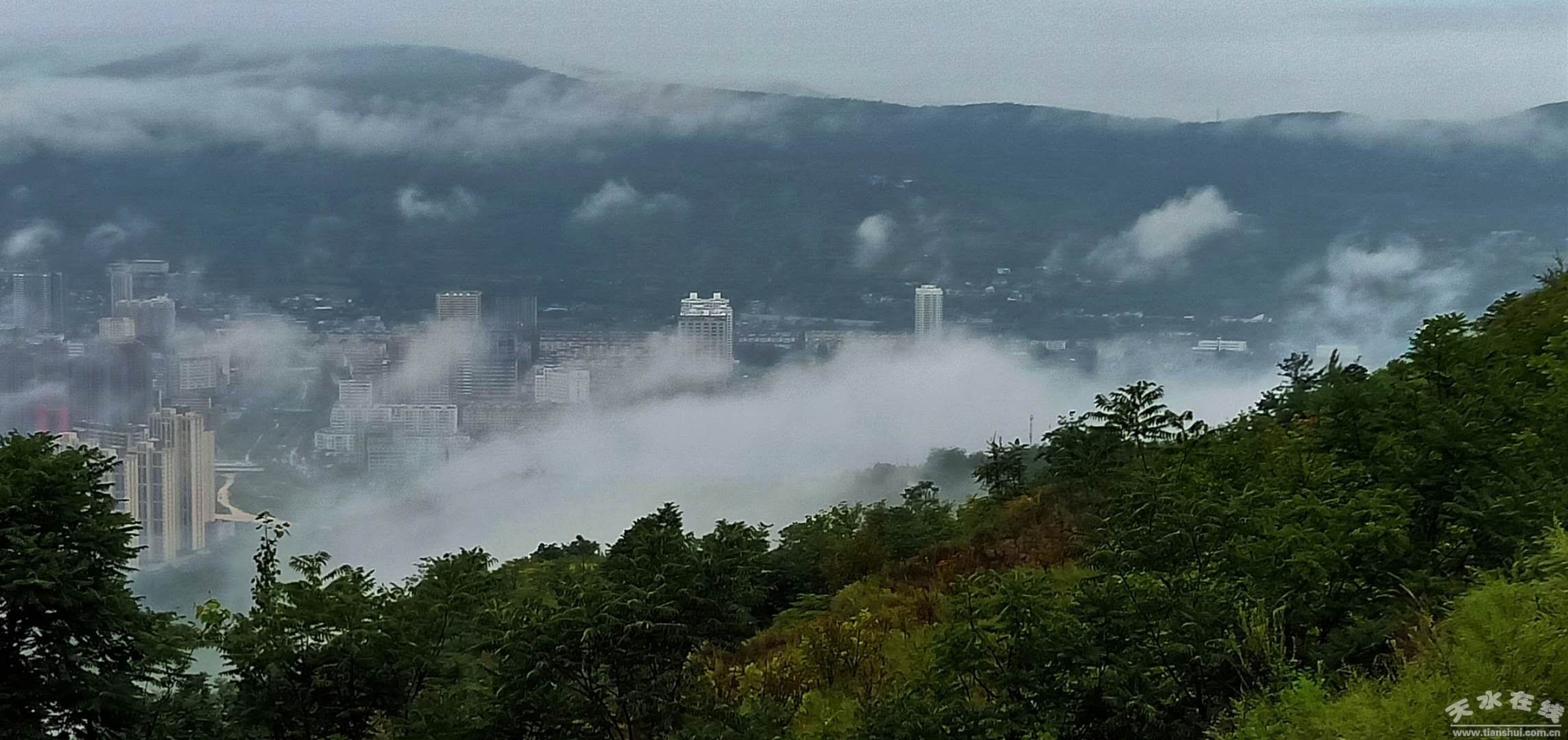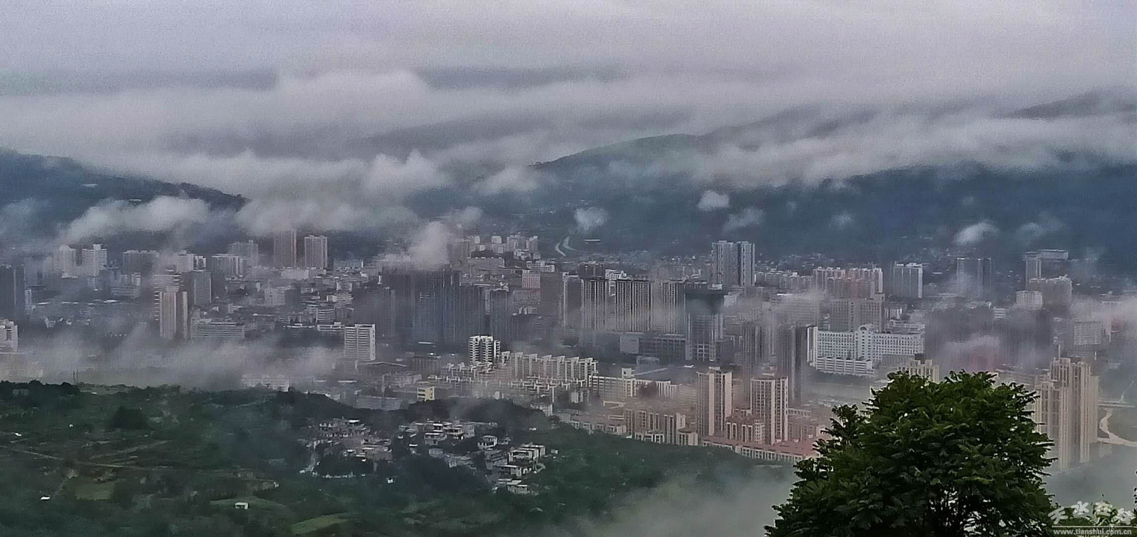 自8月14日上午開始,天水市出現(xiàn)大范圍降水天氣,截止16日07時,全市普降大到暴雨。16日上午7時左右,大雨中的天水,云霧彌漫,宛若仙境。(楊彥東8月16日上午7時攝于南郭寺大景區(qū))