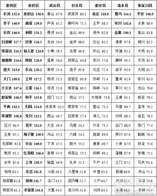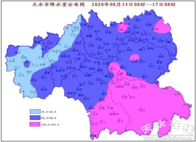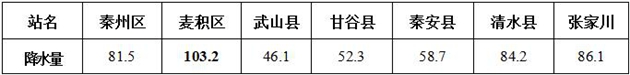14日開始,天水市出現(xiàn)大范圍降水天氣,截止17日08時(shí),有97個(gè)鄉(xiāng)鎮(zhèn)雨量超過50毫米,20個(gè)鄉(xiāng)鎮(zhèn)雨量超過100毫米,最大降水中心位于麥積區(qū)麥積山,達(dá)156.8毫米。