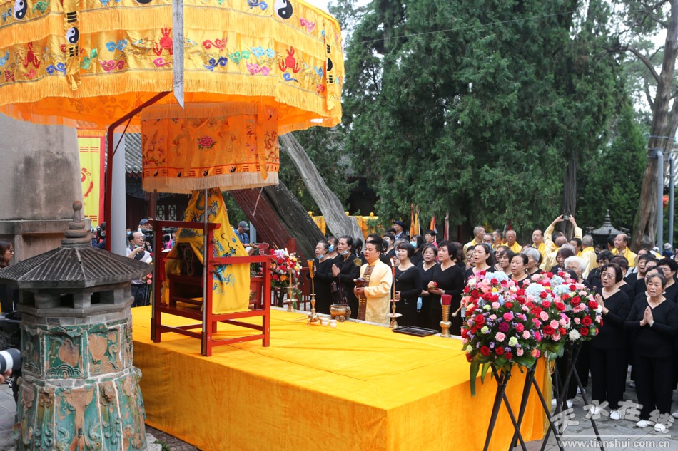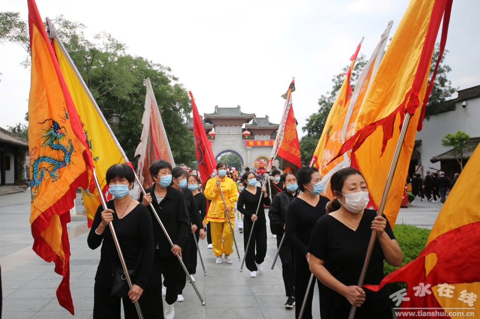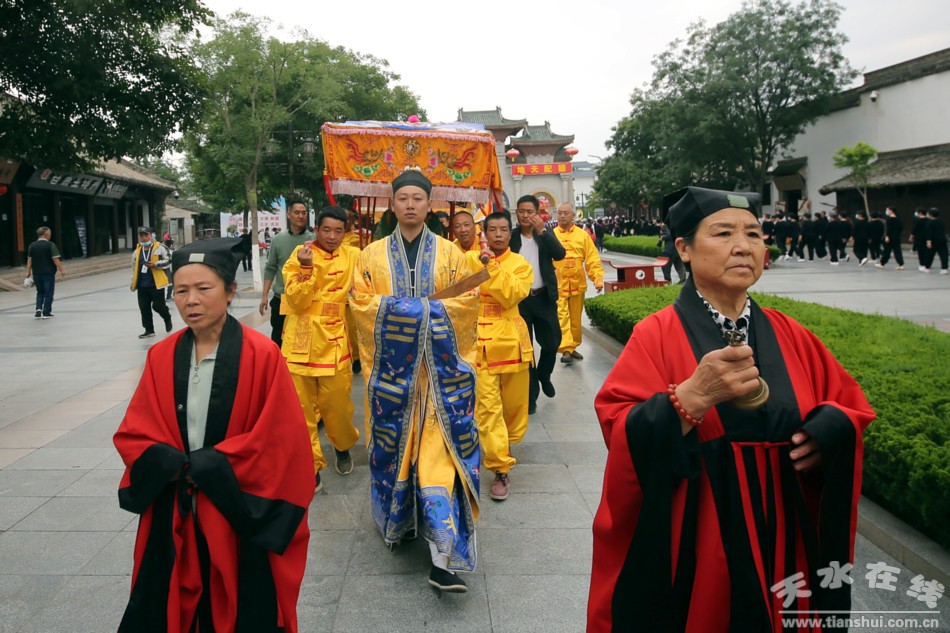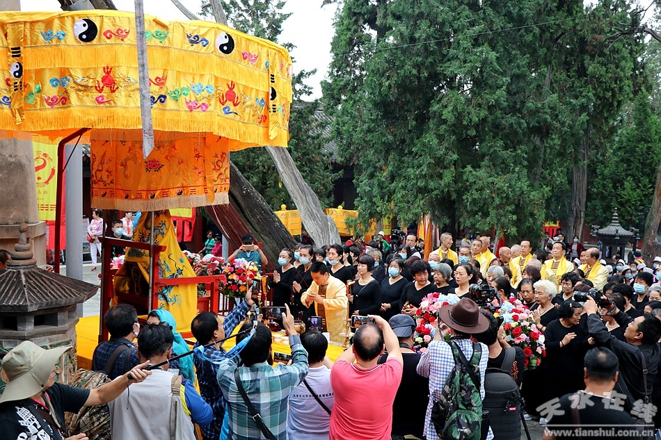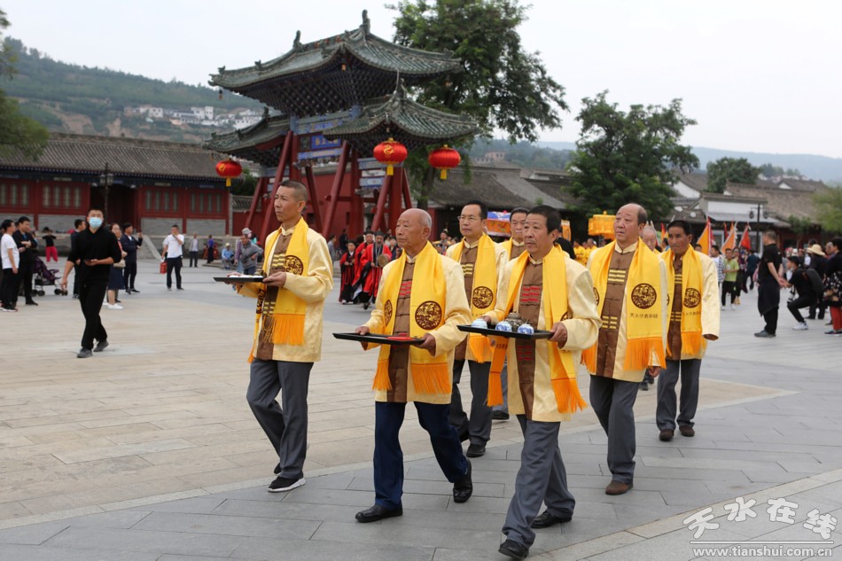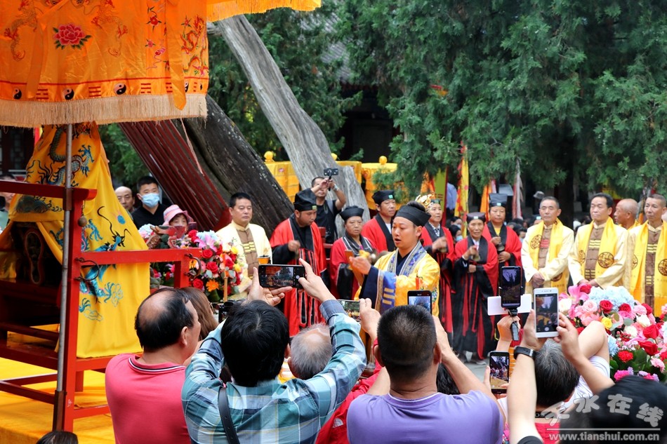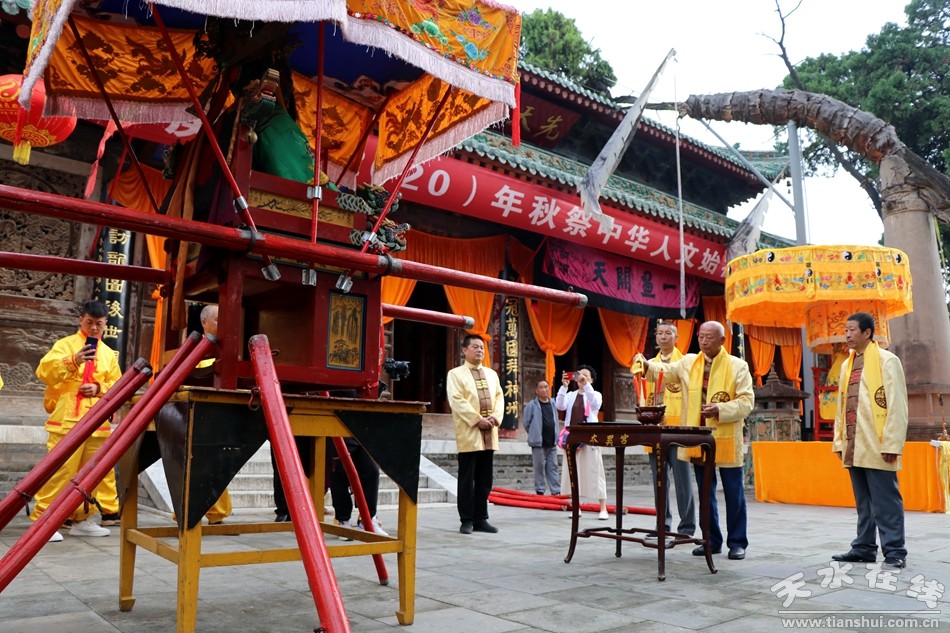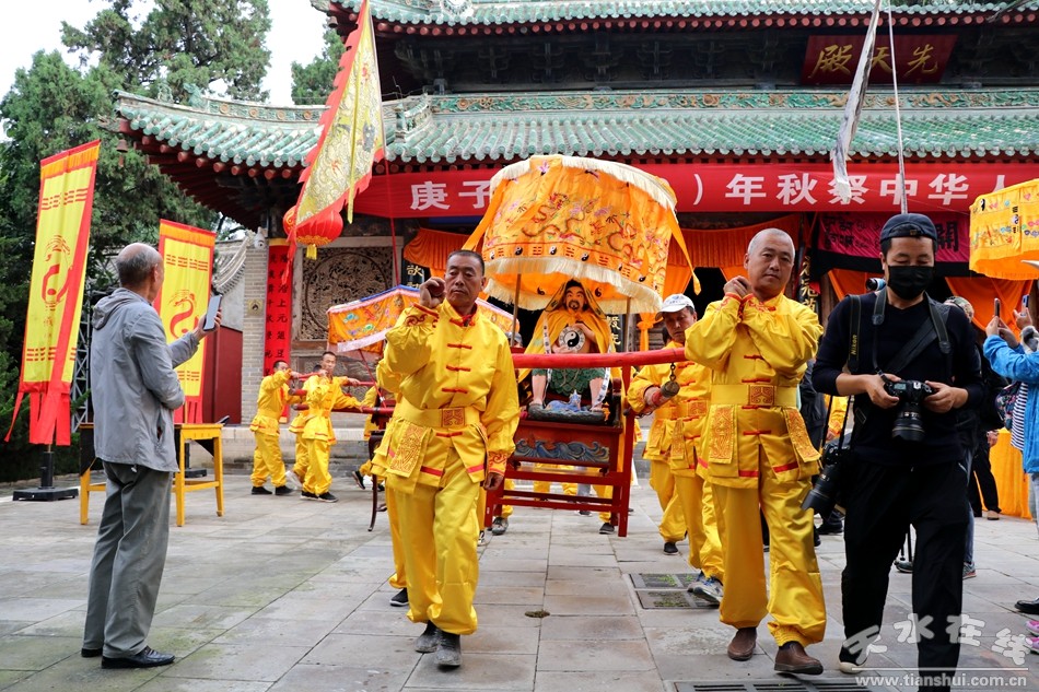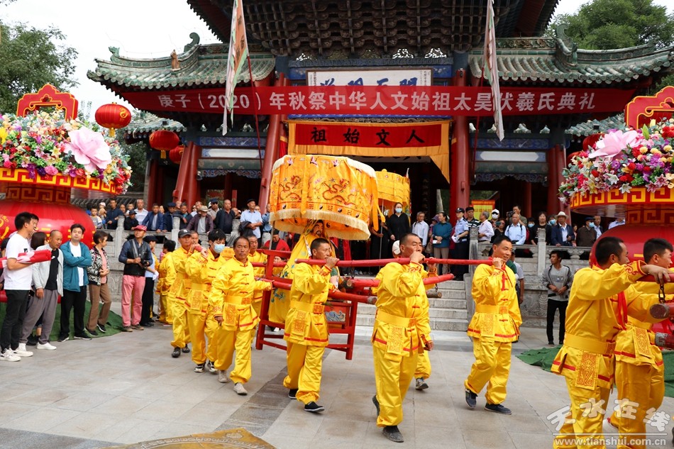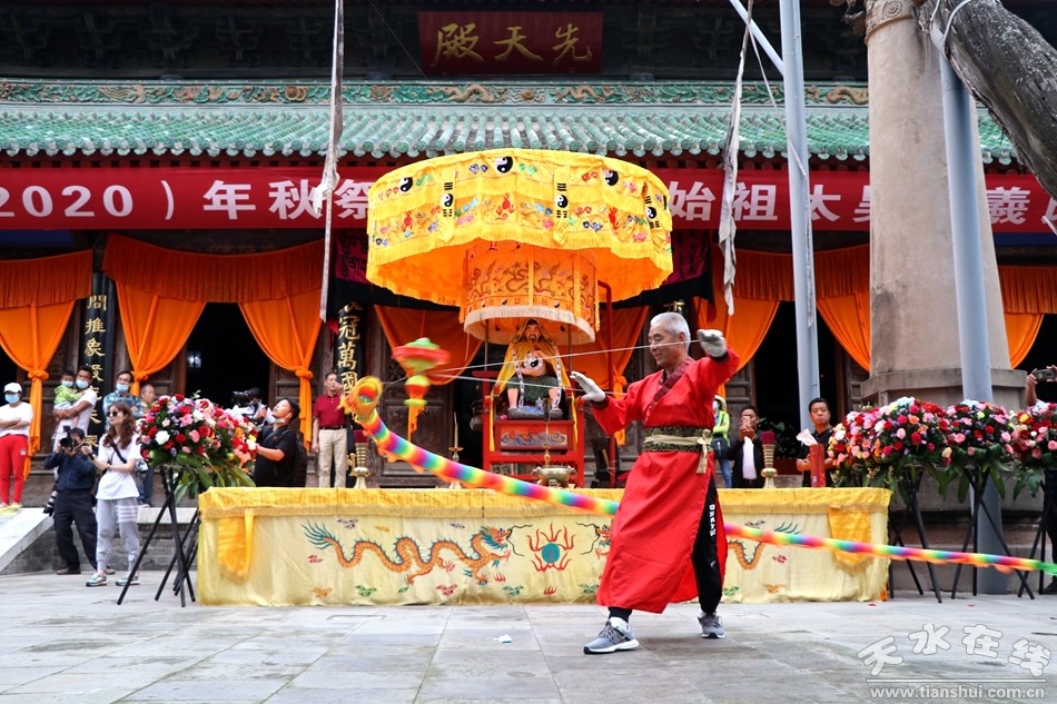9月5日上午,庚子(2020)年秋祭中華人文始祖太昊伏羲氏典禮迎神儀式在伏羲廟先天殿月臺(tái)舉行。8:45分,黑爺行像起駕伏羲廟先天殿恭迎伏羲圣像。