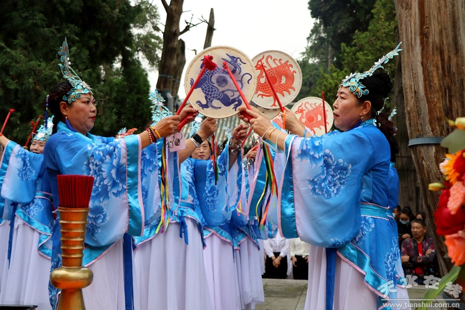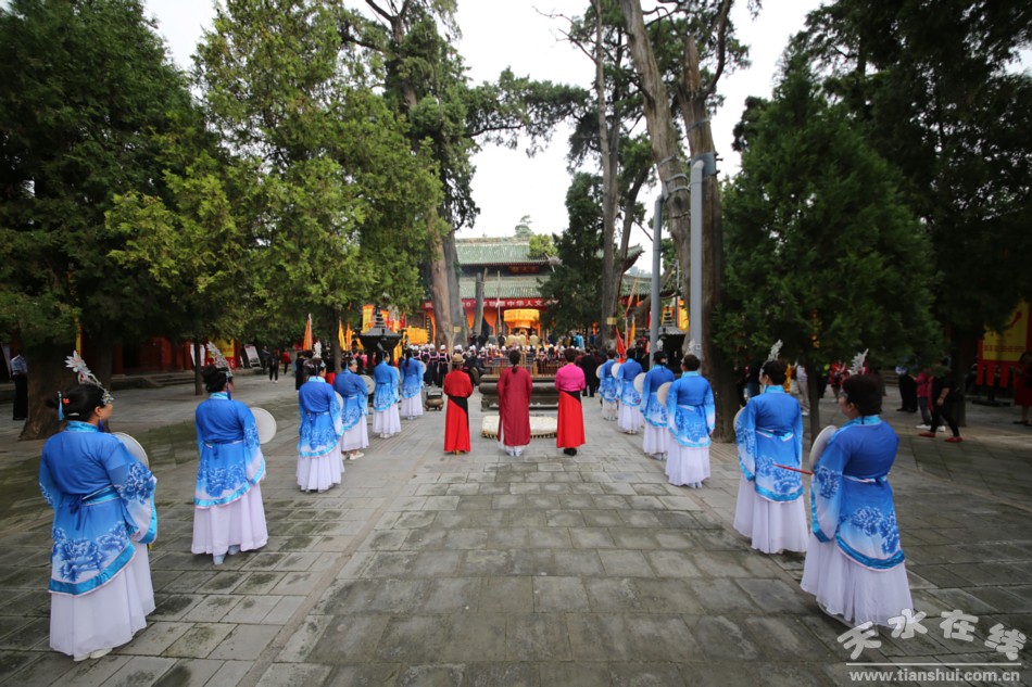 9:00,在伏羲廟先天殿月臺(tái)舉行迎神儀式。詠誦《迎神曲》: 鳴鐘嗚嗚 擊鼓彭彭 今日恭迎 當(dāng)值喜神 敬香五炷 上達(dá)帝廷 群黎百姓 拜祖虔誠(chéng) 迎神誦曲 恭迎羲圣 安神宗廟 為饌供陳 中華大地 風(fēng)調(diào)雨順 福佑百姓 萬(wàn)事康寧