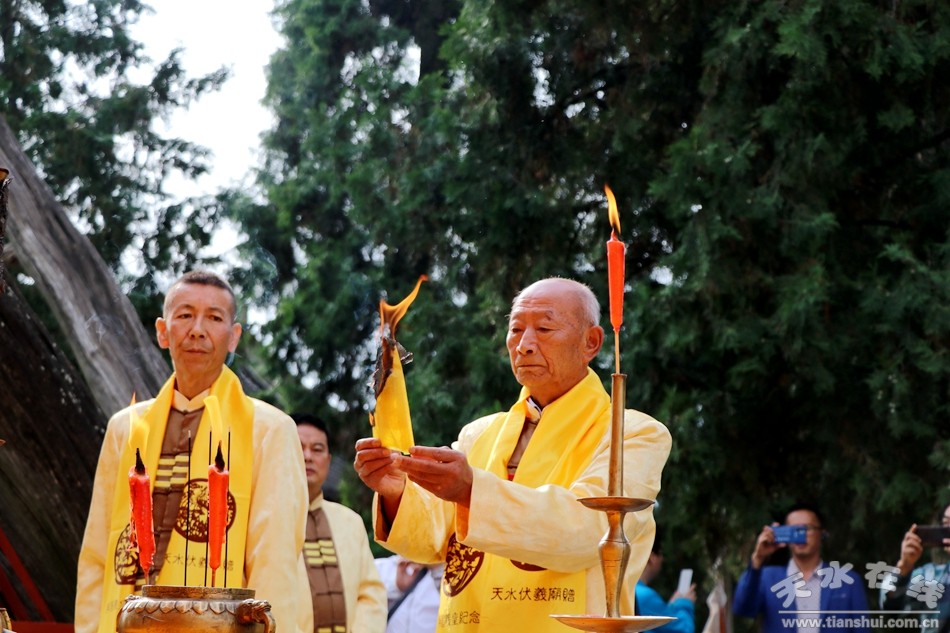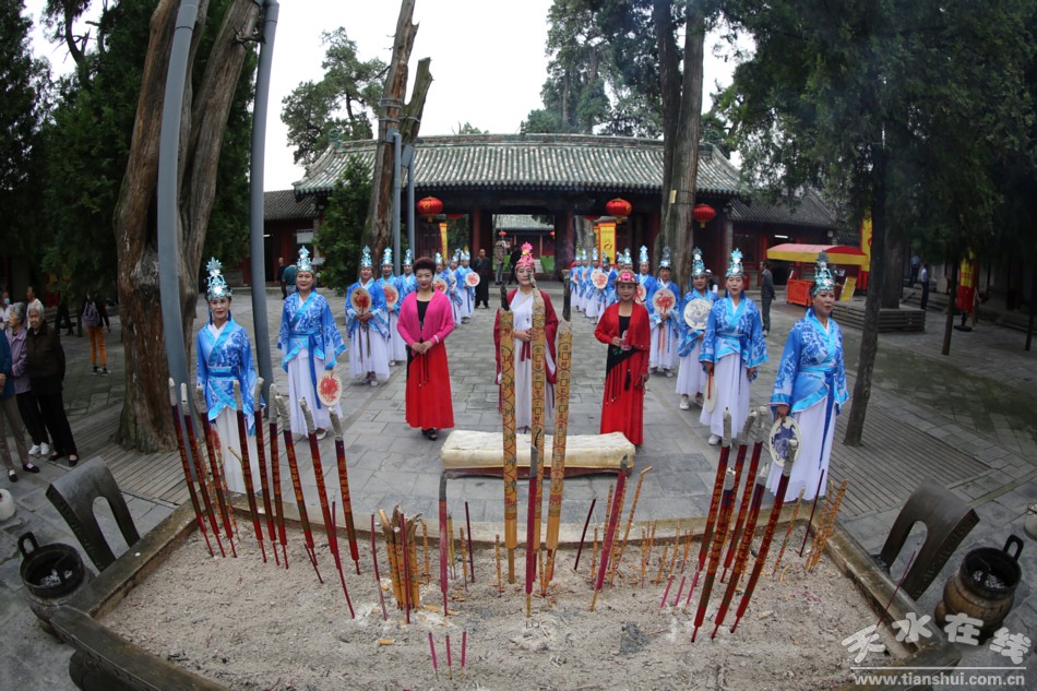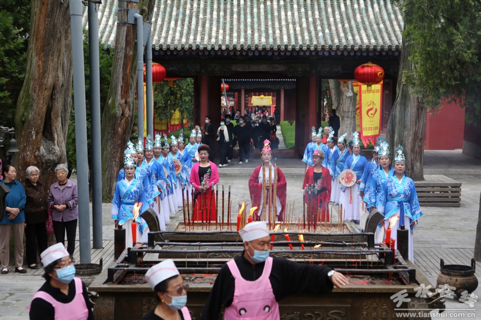 安神儀式: 9:40在伏羲廟先天殿月臺(tái)設(shè)香案舉行安神儀式。主祭人明燭、上香、跪拜化表。 |