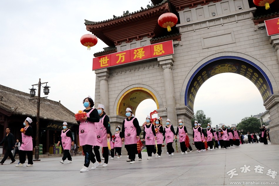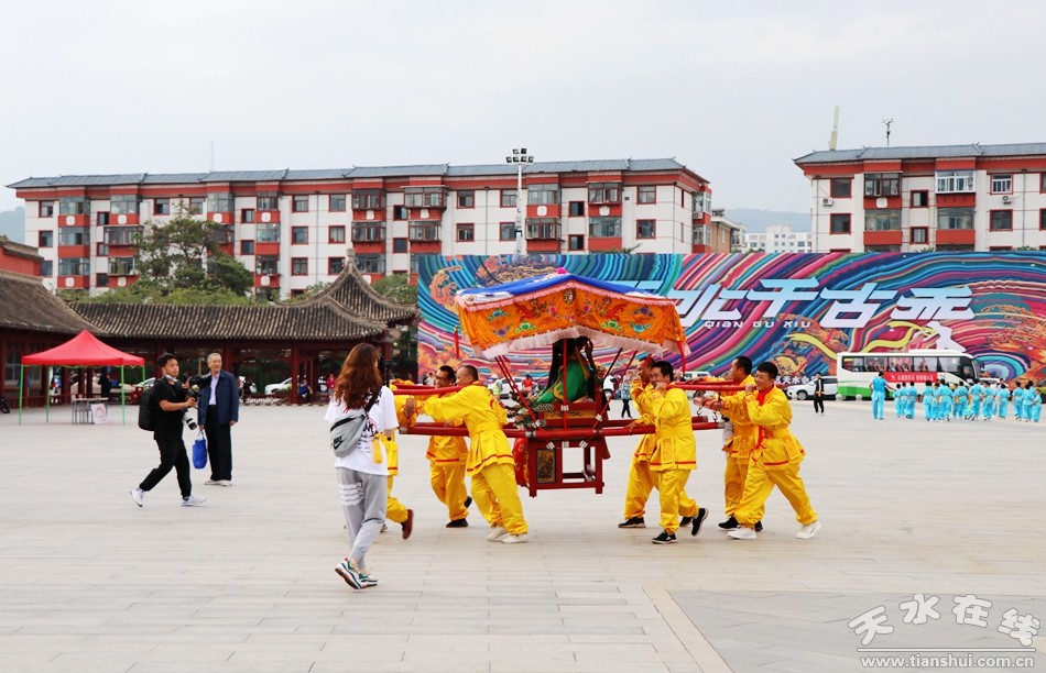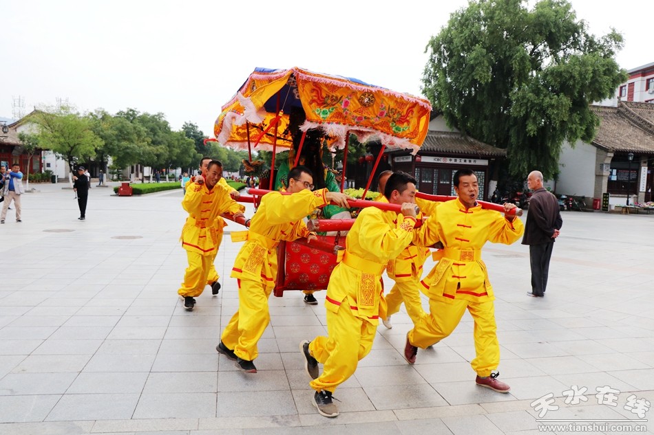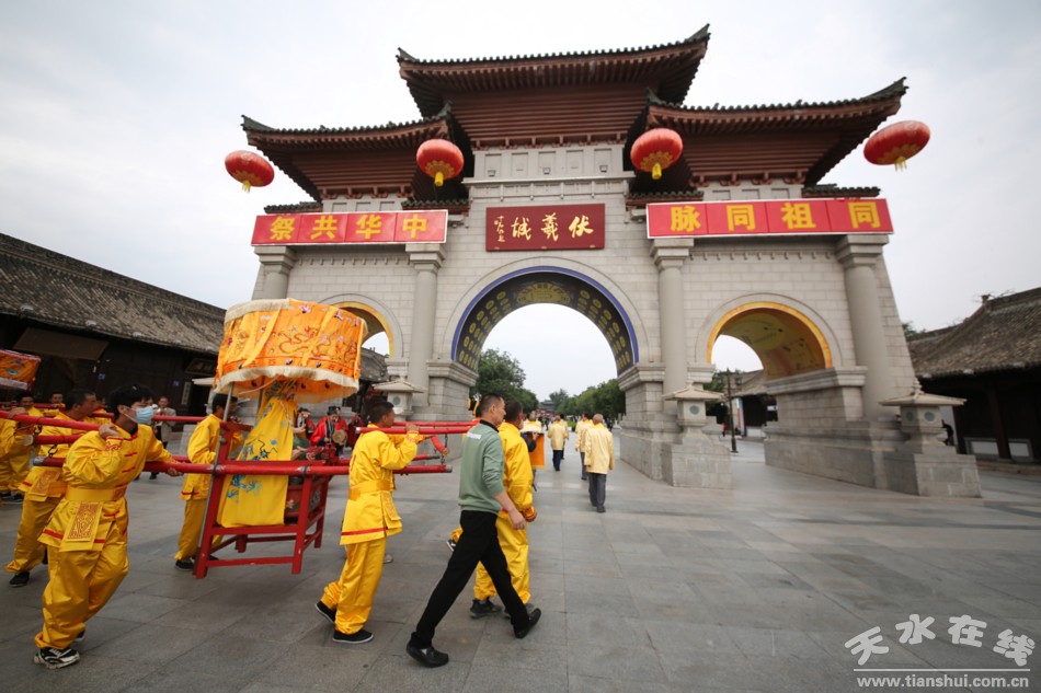 9:15分,伏羲行像由方神黑爺像護(hù)駕前往伏羲城。 行進(jìn)路線:伏羲廟月臺(tái)→西牌坊→伏羲廣場(chǎng)→東牌坊進(jìn)入伏羲廟。