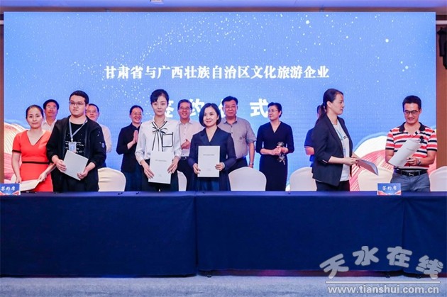 南寧市文旅局局長黃永久,四省市文旅廳(委)相關(guān)處室負責人,甘肅省各市州文旅局負責人,企業(yè)代表和媒體記者等出席參加了會議。隴桂渝川四省區(qū)市文旅部門共同簽訂《聯(lián)合打造“環(huán)西部火車游”品牌備忘錄》,甘肅天水國際旅行社、廣西南湖國際旅行社等近20家旅行社分別簽訂《跨省區(qū)互送游客合作協(xié)議》。