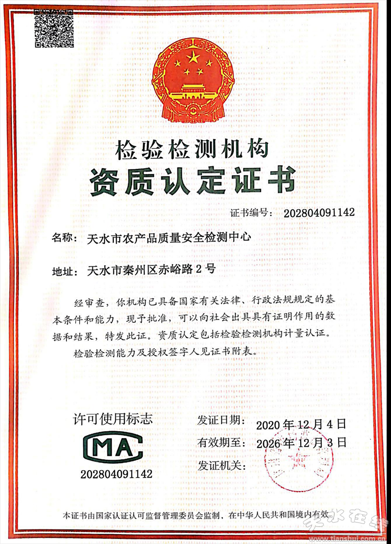 2020年12月底,天水市農(nóng)產(chǎn)品質(zhì)量安全檢測中心獲得了由甘肅省市場監(jiān)督管理局頒發(fā)的檢驗(yàn)檢測機(jī)構(gòu)資質(zhì)認(rèn)定證書(CMA證書),這標(biāo)志著我市農(nóng)產(chǎn)品質(zhì)量安全檢測技術(shù)邁上了一個(gè)新臺(tái)階。