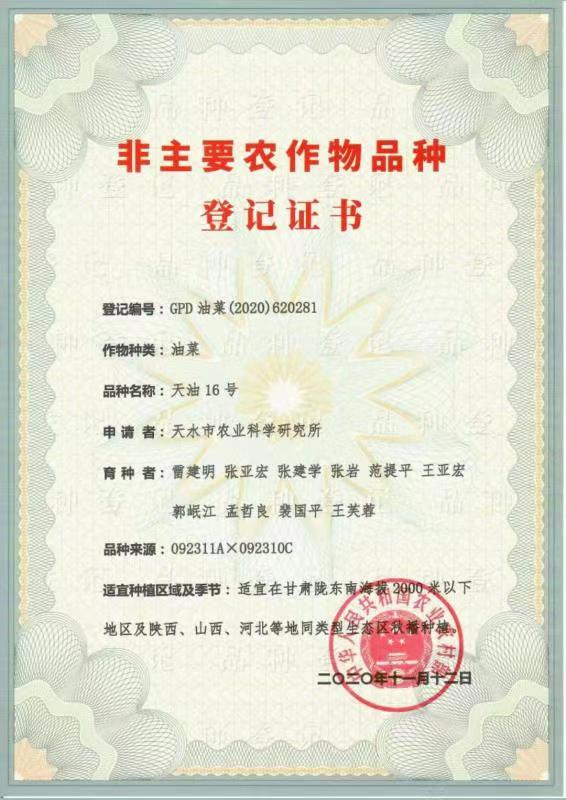 “天油16號(hào)”是我所油料研究中心選育的甘藍(lán)型冬油菜三系雜交品種,也是我所第二個(gè)轉(zhuǎn)化的冬油菜品種!疤煊16號(hào)”(原代號(hào)天油2255)是以細(xì)胞質(zhì)雄性不育系092311A為母本,092310為父本歷經(jīng)多年選育而成的強(qiáng)冬性甘藍(lán)型三系雜交油菜品種,2020年通過農(nóng)業(yè)農(nóng)村部農(nóng)作物品種登記,登記編號(hào)GPD油菜(2020)620281。全生育期290~300天,株高136.09cm,一次有效分枝數(shù)10.08個(gè),二次有效分枝13.8個(gè),結(jié)角密度為1.21個(gè)/cm,全株有效結(jié)角數(shù)387.59個(gè),角果長度7.70cm,角粒數(shù)25.08粒,千粒重4.24g。含油量47.03%,芥酸含量2.54%,硫甙含量74.08ìmol/g。,天油16號(hào)兩年8點(diǎn)次區(qū)域試驗(yàn)中平均產(chǎn)量3158.85kg/hm2,較對照甘雜1號(hào)增產(chǎn)12.73%。適宜在隴東南海拔2000米以下地區(qū)及陜西、山西、河北等地同類型生態(tài)秋播種植。