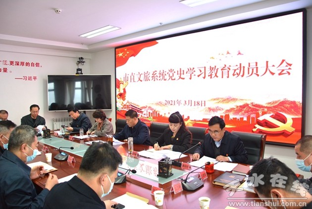 3月18日,市文化和旅游局黨組召開市直文旅系統(tǒng)黨史學(xué)習(xí)教育動員大會。局黨組成員、調(diào)研員,各黨支部(總支)書記、黨務(wù)工作者,局機(jī)關(guān)各科室長,局業(yè)務(wù)主管各社會組織黨支部書記參加會議。