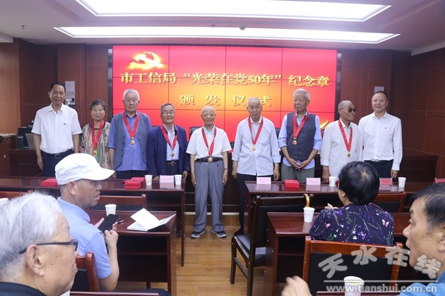 一百年風(fēng)華正茂,五十載初心如磐。為紀(jì)念建黨100周年,6月24日,天水市工信局舉行“光榮在黨50年”紀(jì)念章頒發(fā)儀式。黨組書(shū)記、局長(zhǎng)康泰來(lái)主持并為老黨員頒了發(fā)紀(jì)念章。