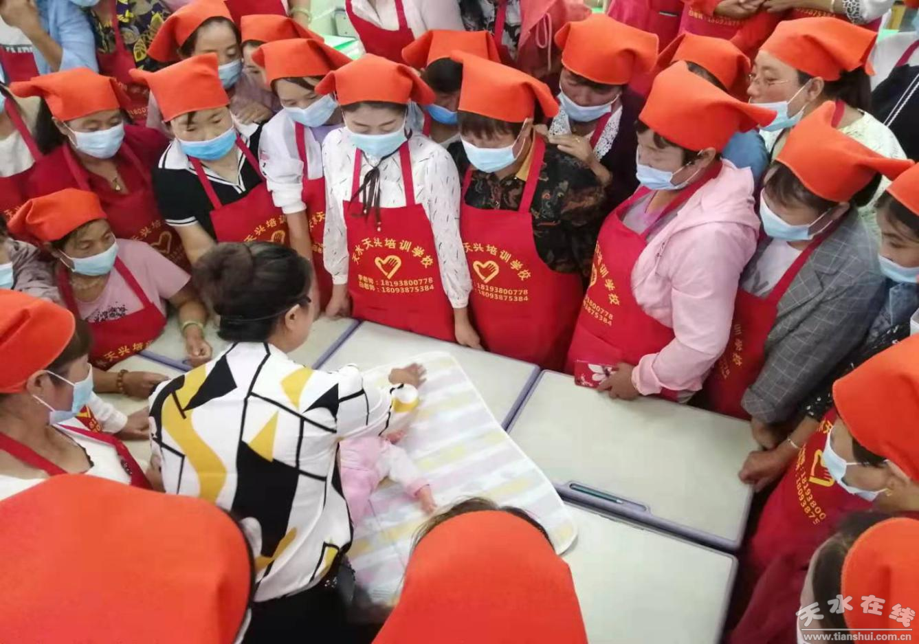 8月的天水,艷陽高照,瓜果飄香,一派豐收的喜人景象。在秦州區(qū)藉口鎮(zhèn)四十鋪村幼兒園院內,該村170多名婦女,頭戴紅頭巾,身圍紅圍裙,精神抖擻,跟著音樂的節(jié)拍,展示服務禮儀、包裹嬰幼兒以及嬰幼兒被動操,贏得了群眾一陣陣熱烈掌聲。這是在天水市“三送三提高”活動啟動儀式上,由市人社局組織,天水市天興電子電器職業(yè)技能培訓學校舉辦的家政服務員技能培訓班結業(yè)典禮的學員,展示家政服務技能的現場一幕。