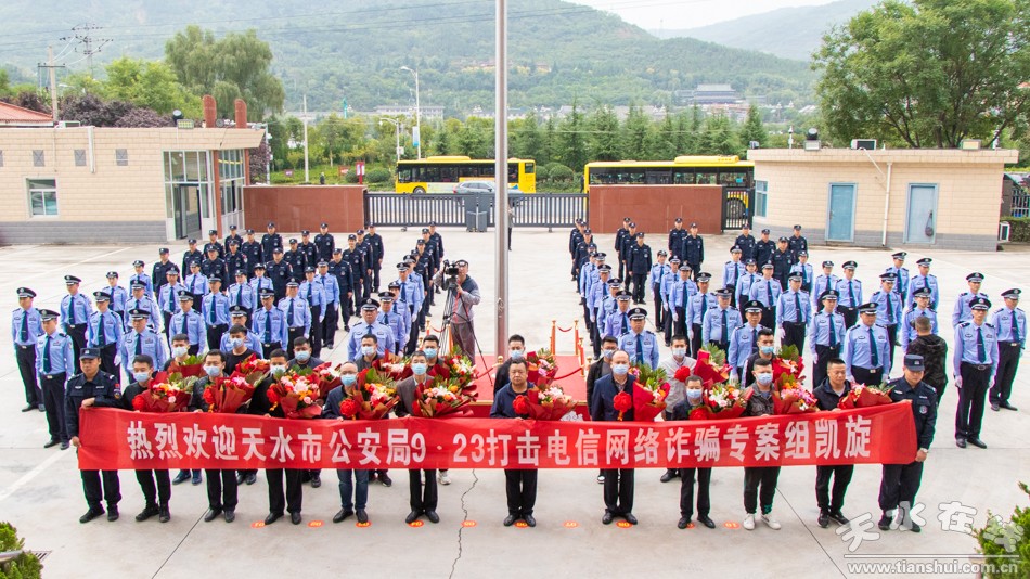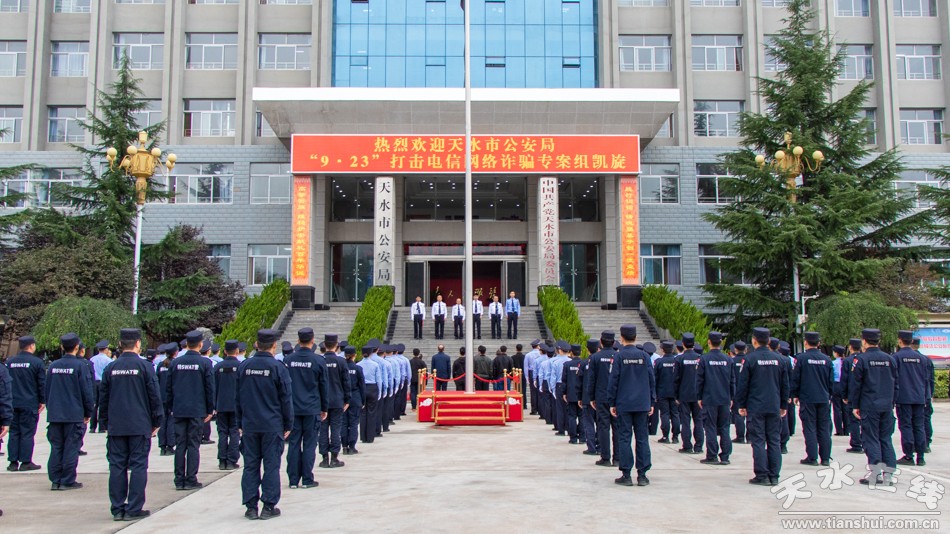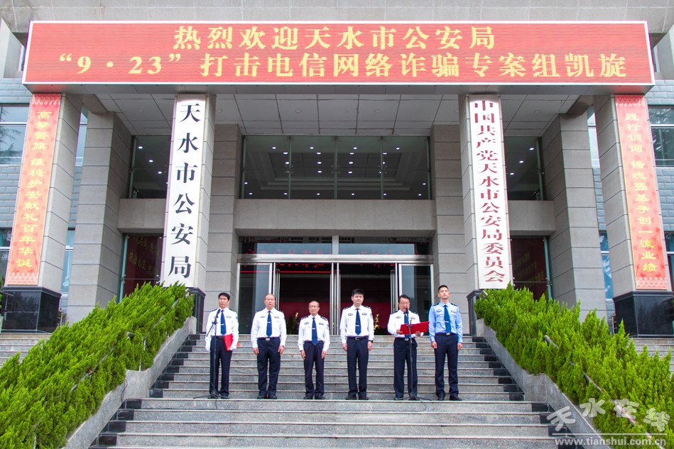 9月27日上午,天水市公安局隆重舉行“9·23”打擊電信網絡詐騙專案組凱旋歡迎儀式。公安部刑偵局二級巡視員鄭翔、省公安廳一級警務專員劉琪基出席歡迎儀式并對專案民警進行慰問,副市長、市公安局黨委書記、局長郭慶祥致辭。