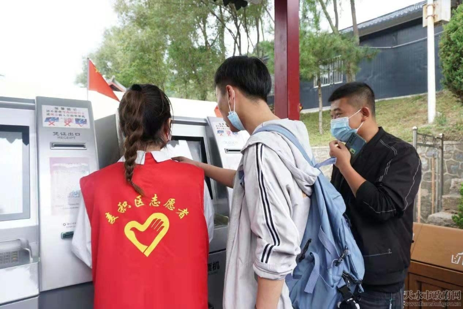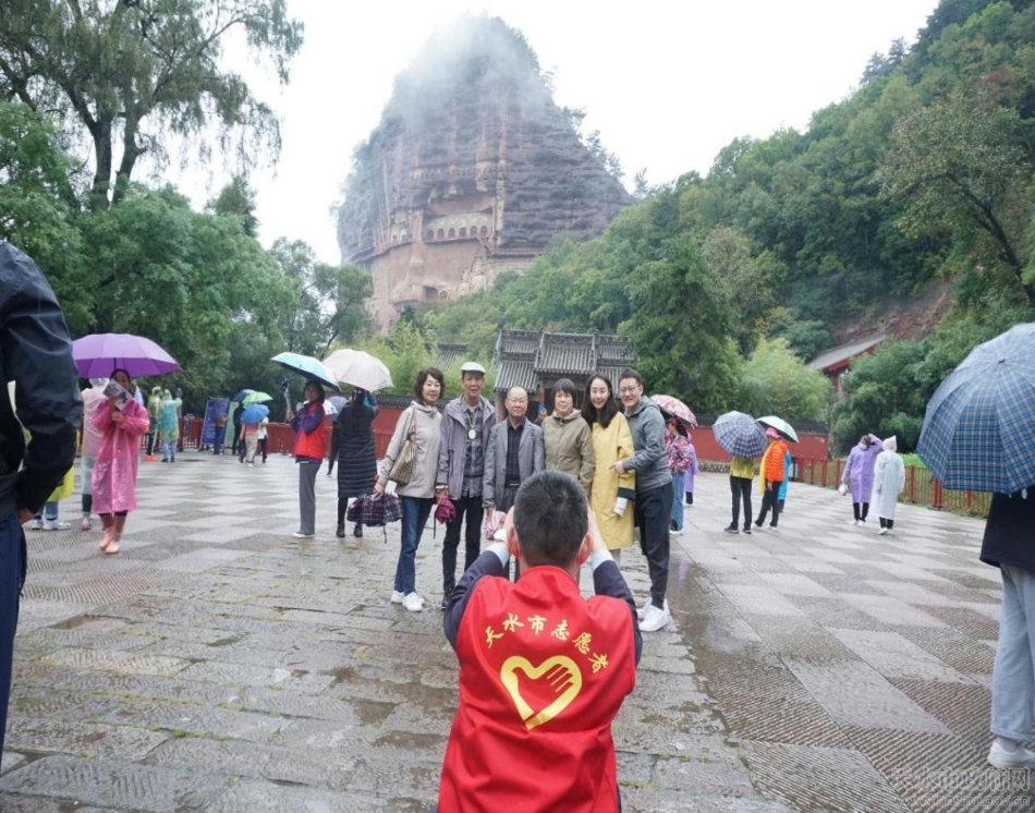 (游客紛紛在麥積山石窟廣場打卡留念)