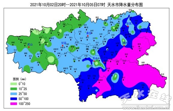 【摘要】4日白天到夜間我市降水持續(xù),全市普降中雨,其中,張家川縣、清水縣、麥積區(qū)中東部、秦州區(qū)南部出現(xiàn)大雨(25.0~43.5毫米)。10月02日20時(shí)至05日07時(shí),全市共有18個(gè)鄉(xiāng)鎮(zhèn)雨量超過(guò)100毫米,5個(gè)鄉(xiāng)鎮(zhèn)雨量超過(guò)150毫米,累積最大降水出現(xiàn)在清水縣秦亭鎮(zhèn),達(dá)177.6毫米。