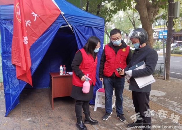 一、聞令而動,協(xié)助社區(qū)開展核酸檢測。10月24日,按照市委疫情防控工作部署,天水市檔案館志愿服務(wù)隊15名隊員迅速奔赴秦州區(qū)盛源社區(qū)協(xié)助開展核酸檢測工作。面對時間緊,任務(wù)重的嚴(yán)峻形勢,10月24日至25日,市檔案館志愿服務(wù)隊每天分三班(上午、下午、晚上)值守,每個小組均由縣級領(lǐng)導(dǎo)干部帶隊,負(fù)責(zé)工作調(diào)度。在盛源社區(qū)核酸檢測點,市檔案館志愿者協(xié)助社區(qū)工作人員和醫(yī)務(wù)人員開展全員核酸檢測,維護前來進行核酸檢測的群眾秩序,對扎堆人群進行勸解,讓排隊的群眾保持一米以上距離,指導(dǎo)核酸檢測群眾進行健康碼核驗和信息登記,幫助行動不便的老人和部分不識字的群眾進行信息登記,協(xié)助醫(yī)務(wù)人員進行體溫測量等工作。兩天累計發(fā)放和協(xié)助群眾填寫登記表2480余份,確保了核酸檢測工作安全有序推進。