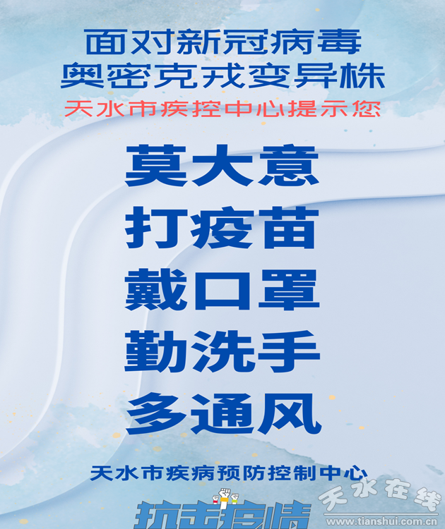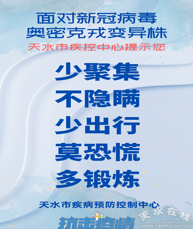 天津、廣東相繼檢出新冠病毒奧密克戎變異株,為繼續(xù)堅(jiān)持“外防輸入,內(nèi)防反彈”的總體策略,嚴(yán)格落實(shí)入境人員和貨物管理,嚴(yán)防奧密克戎變異株的輸入和傳播,天水市疾控中心提示您: