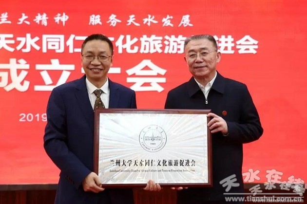 2019年3月30日下午,蘭州大學天水同仁文化旅游促進會成立。甘肅省政協(xié)副主席、天水市委原書記王銳授牌,蘭州大學原黨委書記袁占亭授旗。84級經(jīng)濟系校友、天水66號文化創(chuàng)意園董事長劉曉武當選會長。