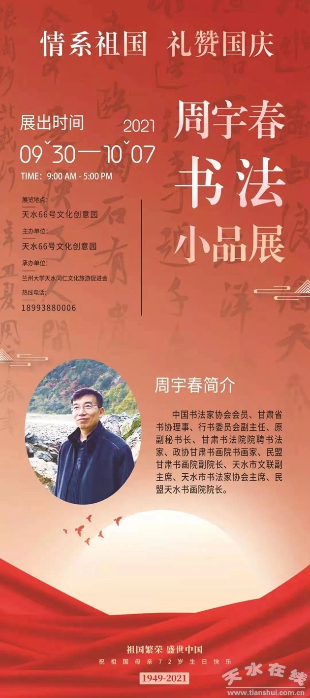 2021年9月30日,為慶祝中華人民共和國成立七十二周年,天水66號文化創(chuàng)意園、蘭州大學天水同仁文化旅游促進會舉辦了《“情系祖國 禮贊國慶”——周宇春書法小品展》。
