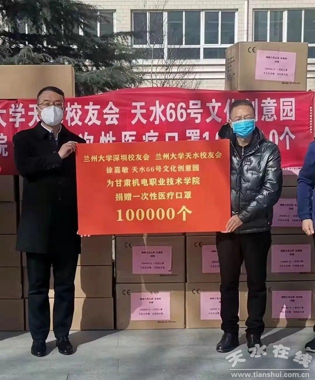 ▲為天水市職業(yè)技術學校捐贈醫(yī)用口罩一萬個