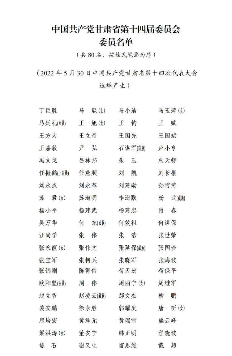 中國共產(chǎn)黨甘肅省第十四屆委員會委員名單