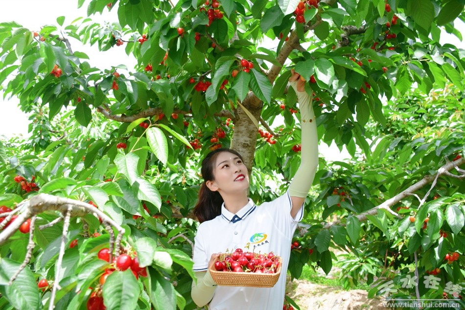 (圖為天水在線主播萌萌在煙鋪櫻桃園采摘櫻桃)