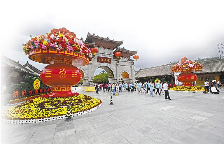 伏羲廟廣場上,來自五湖四海的嘉賓代表身穿深色服裝,佩帶黃色綬帶肅然而立。這里,一場盛大的祭拜大典即將開啟。