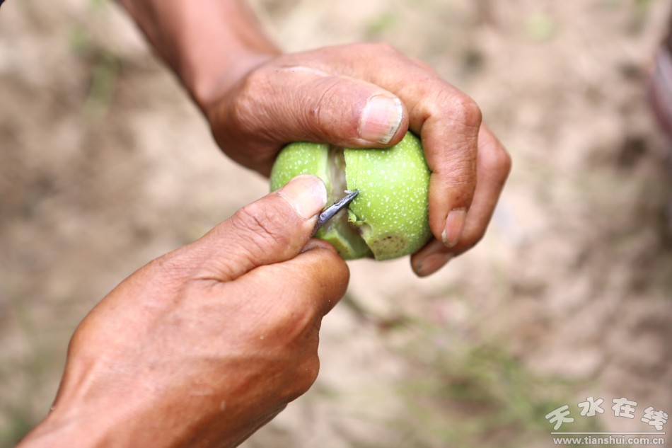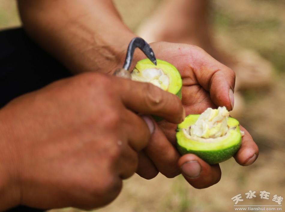 核桃要過了白露才能收獲,但到八月份就可以吃了,而且,嫩核桃仁比成熟了的更可口。天水開發(fā)出“鮮核桃”的概念,就是吃這種將熟而未完全成熟的核桃。在我小時(shí)候,這種吃法主要是小孩子的專利,而且和“偷核桃”密不可分地聯(lián)系在一起,要冒被罵甚至被打的風(fēng)險(xiǎn)。時(shí)代發(fā)展進(jìn)步,不僅人有了“小鮮肉”,核桃也有了鮮的。雖不是“穿衣顯瘦,脫衣有肉”,給核桃“脫衣”,卻不是件容易事。