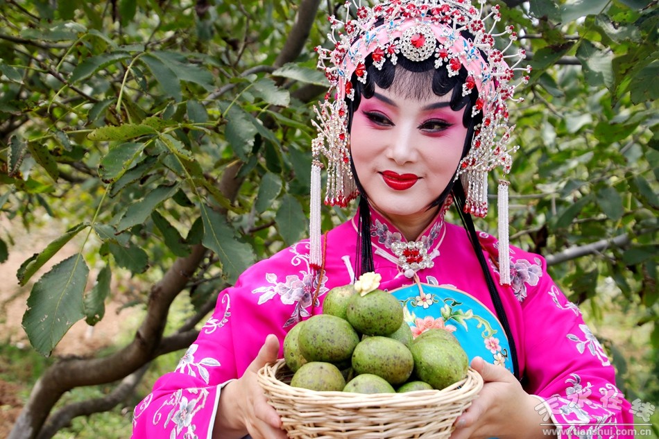 核桃不成熟時(shí),仁外面的薄皮發(fā)苦,不能吃,但撕下非常利索。輕輕揭開黃衣,又嫩又白的核桃仁就出現(xiàn)了。放進(jìn)嘴里一咬,脆、嫩、甜,還有絲絲青草氣息,一點(diǎn)點(diǎn)汁液在口中游走。把幾大片嫩核桃仁一起放在嘴里大嚼,真是過癮!這就是“鮮食”了。前不久,清水縣請(qǐng)著名秦腔演員、新科戲劇“梅花獎(jiǎng)”獲得者袁丫丫代言的“青皮核桃”,就是這味道感覺。我生長(zhǎng)的山西長(zhǎng)治,為黃土高原最高處,古人形容“與天為黨”,故名“上黨”。本來一直以為天是蒼天之天,現(xiàn)在想來,也是天水之天了。我的家鄉(xiāng)和天水,不為鄰,卻為黨,性相近也,習(xí)亦相近也,風(fēng)俗文化,相似處殊多。自小耳濡目染的,是上黨邦子、上黨落子,和秦腔有類同者。自蘭州讀書,二十年來,秦腔入耳不少,感覺既如“關(guān)西大漢,銅琵琶,鐵綽板,唱大江東去”,又似哀婉纏綿的秦婦吟。核桃,正有秦腔的品質(zhì)。肉的青皮包裹著的,是堅(jiān)硬木質(zhì)的殼,殼里面,又是嫩脆的仁。柔而剛、剛而柔,層層各有洞天。人們常宣傳核桃全身都是寶,其實(shí),更本質(zhì)的,是它和所生長(zhǎng)之土地血脈氣韻的通連。