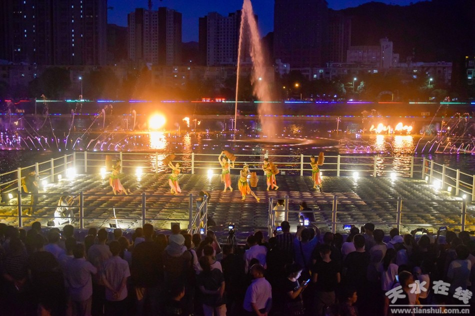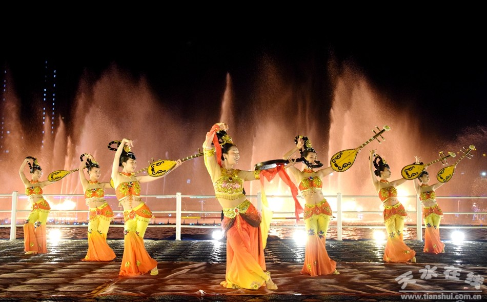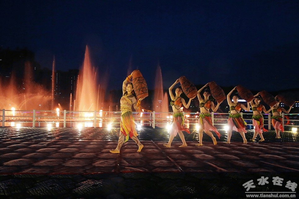 (圖為天水在線主播萌萌在天水湖音樂噴泉表演“大地灣女神”)