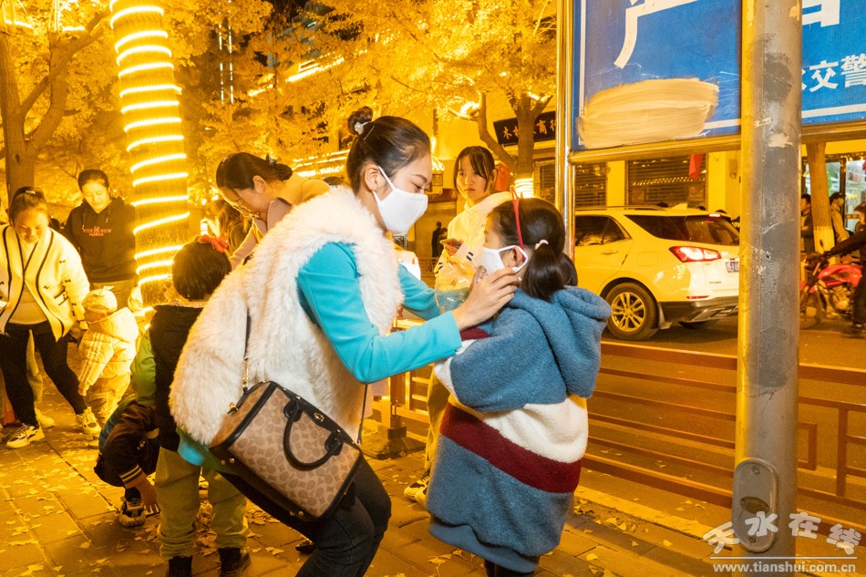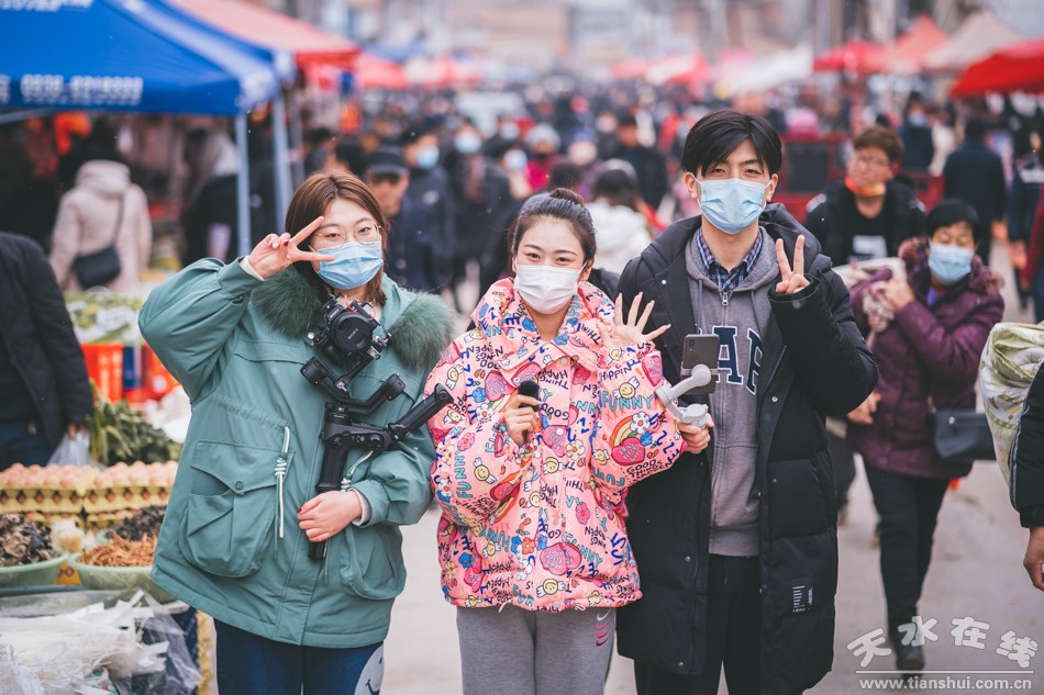 (圖為天水在線主播萌萌在秦州區(qū)“黃金大道”向行人發(fā)放口罩)