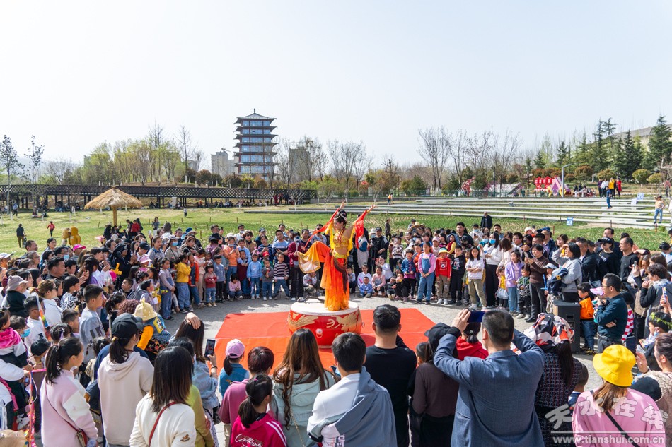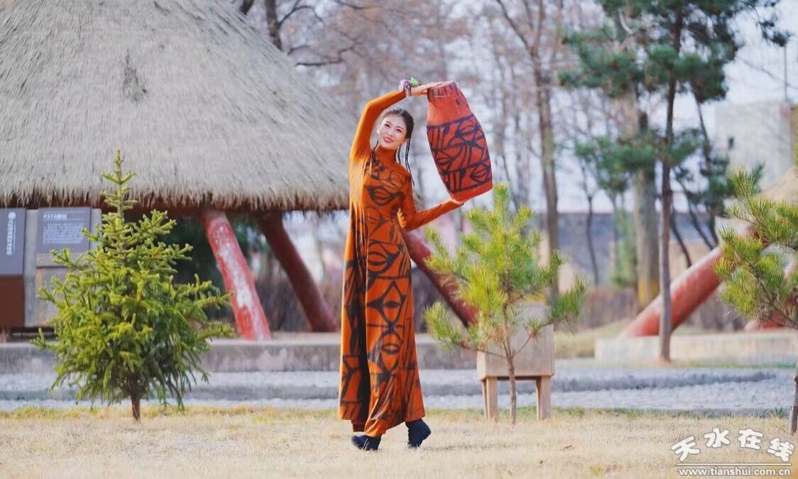 (圖為天水在線主播萌萌在翠湖表演“麥積飛天”)