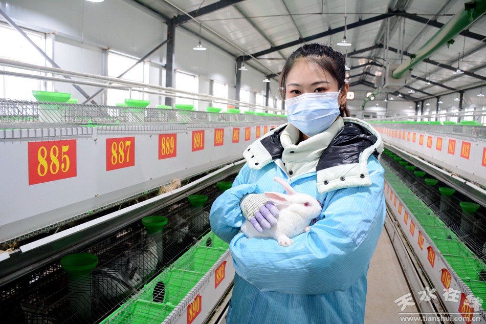 (圖為天水在線主播萌萌采訪清水農發(fā)公司獺兔養(yǎng)殖情況)
