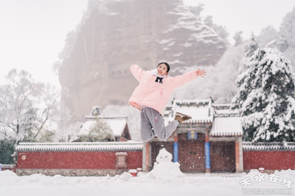 (圖為天水在線主播萌萌在馬跑泉公園表演“麥積飛天”)