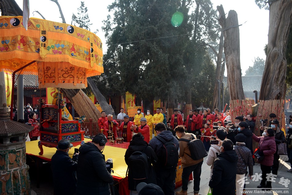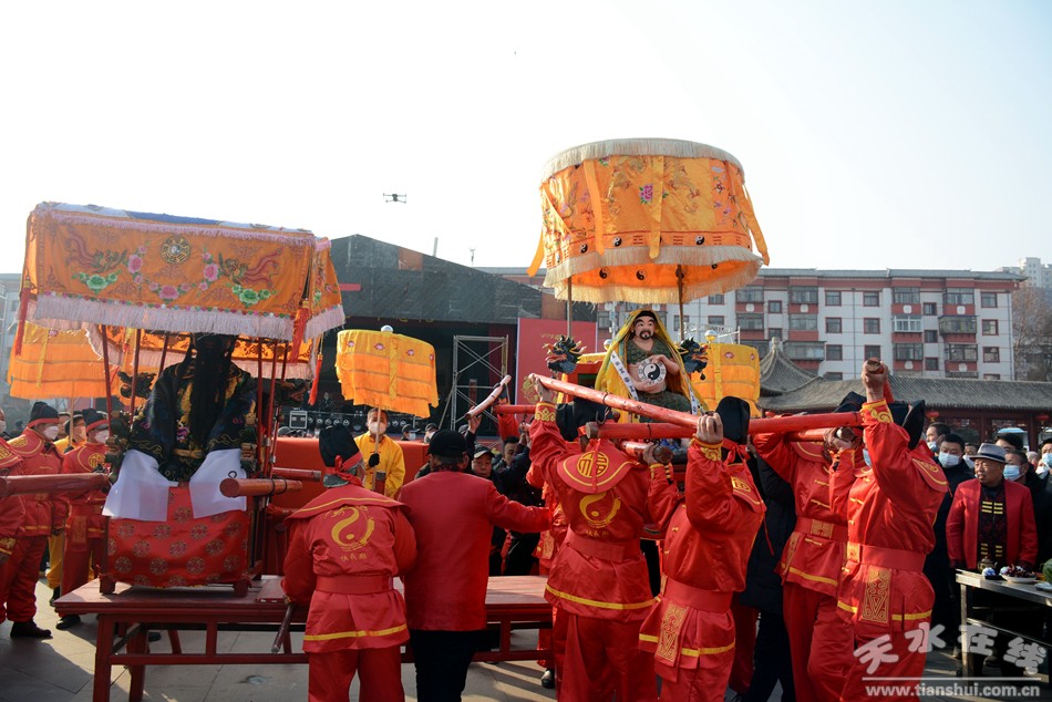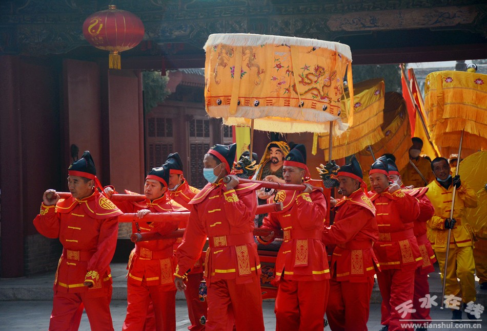 伏羲行像由方神黑爺護駕起程前往伏羲城,儀仗隊繞城一周,在伏羲廣場舉行迎神儀式。