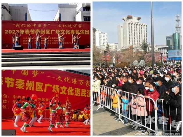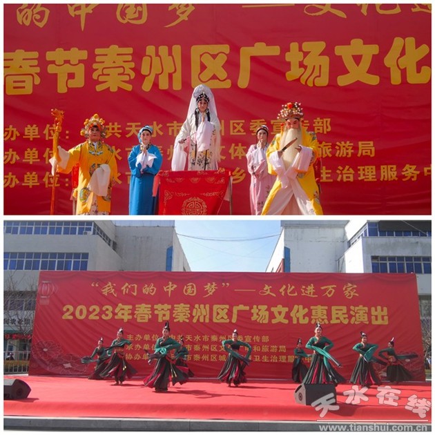 冬日暖陽照、文化進萬家!拔覀兊闹袊鴫簟幕M萬家”秦州區(qū)廣場文化惠民演出在龍城廣場演出6天6場;“玉兔鬧新春·輝煌新征程”春節(jié)民間民俗藝術匯演(社火匯演)正月十二盛大重啟;“龍城舞動中國龍·祈福納祥迎新春”秦州區(qū)首屆舞龍文化藝術節(jié)啟新篇、開新局;“名家薈萃唱響秦風古韻·千秋桑梓共祭人文始祖”秦腔名家專場演出,特邀陜西省戲曲研究院7名梅花獎得主、13名國家一級演員傾情獻藝;麥積區(qū)“玉兔卦臺鬧元宵”秦腔優(yōu)秀劇目展演、秦安縣“過年七天樂”群眾文化活動匯演、武山縣“三堡九灣”民俗展演、甘谷縣慶新春秦腔公演、清水縣“啟航新征程·奮進新時代”迎新春秦腔展演、各縣區(qū)迎新春送春聯(lián)送福字等文化惠民活動,讓廣大群眾在喜慶歡樂中切切實實感受到了濃濃的年味,也讓廣大戲迷朋友們過足了戲癮。
