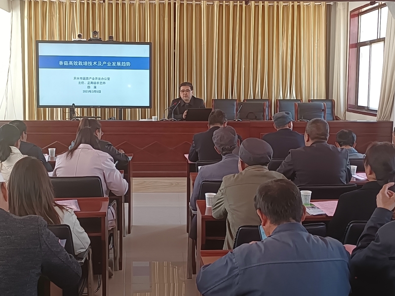 3月5日,專家組一行在武山縣龍臺鎮(zhèn)政府舉辦了羊肚菌和香菇栽培技術(shù)培訓(xùn)會,秦州區(qū)高新技術(shù)服務(wù)中心正高級工程師王俊羿圍繞羊肚菌的菌種選擇、土壤處理、栽培管理、環(huán)境調(diào)控、病蟲害防控等方面,市蔬菜辦正高級農(nóng)藝師田溪分別圍繞香菇的菌種制備、栽培料配制、滅菌接種、保濕膜袋應(yīng)用、養(yǎng)菌轉(zhuǎn)色、催蕾育菇等方面,為龍臺鎮(zhèn)50多名鎮(zhèn)村干部和食用菌種植戶農(nóng)戶進(jìn)行深入淺出的講解和交流,并發(fā)放《香菇栽培技術(shù)》《黑木耳栽培技術(shù)》《食用菌高效栽培技術(shù)100問》等培訓(xùn)教材100本、明白紙200余份。