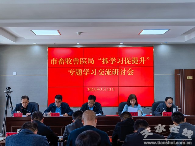 3月13日,天水市畜牧獸醫(yī)局召開(kāi)“抓學(xué)習(xí)促提升”專題學(xué)習(xí)交流研討會(huì),會(huì)議緊緊圍繞“思想要提升,我要懂什么”,深入學(xué)習(xí)了習(xí)近平總書記在中共中央民主協(xié)商會(huì)、中共中央政治局第三次集體學(xué)習(xí)上的重要講話精神、中國(guó)共產(chǎn)黨第二十屆中央委員會(huì)第二次全體會(huì)議公報(bào)和黨的二十大報(bào)告部分章節(jié)。領(lǐng)導(dǎo)班子成員緊扣“全市畜牧業(yè)要發(fā)展,我該謀什么”主題,結(jié)合各自工作職責(zé),開(kāi)展交流研討,切實(shí)做到在交流碰撞中提升思想水平。局領(lǐng)導(dǎo)班子成員、局屬各單位主要負(fù)責(zé)人、局機(jī)關(guān)全體干部職工參加會(huì)議。