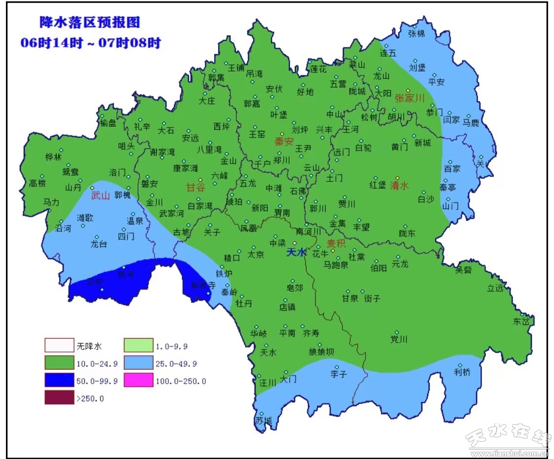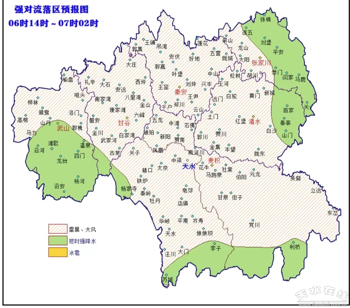 預(yù)計6日下午到夜間,我市大部將出現(xiàn)雷雨大風(fēng)、短時強降 水等強對流天氣。主要時段在6日14時~7日05時,武山南部、甘谷南部、秦州西部和南部、麥積南部、清水東部和張家川北部有短時強降水,最大小時雨強30~50毫米,上述區(qū)域部分鄉(xiāng)鎮(zhèn)過 程最大累積降水量70~90毫米。
