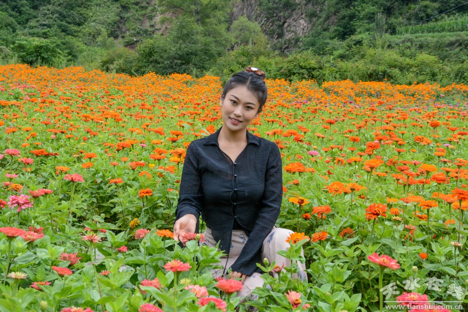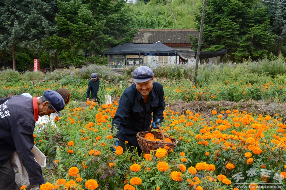 8月7日,天水在線主播萌萌一行來到甘谷縣古坡鎮(zhèn)大卜峪村萬壽菊種植基地看到,這里的萬壽菊已經(jīng)競相綻放、花開成海,開始采收。