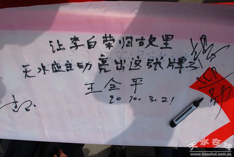 經(jīng)過幾天的籌備,2010年3月21日,天水在線發(fā)起了一場“李白故里在天水”的正名活動。2010年3月25日,雷達(dá)先生發(fā)表文章,對天水在線發(fā)起的正名活動給予了高度評價,雷達(dá)先生在文中寫道:我在博客貼出《李白故里在甘肅秦安》一文并經(jīng)天水在線轉(zhuǎn)發(fā)后,甘肅天水當(dāng)?shù)兀ㄇ匕矊儆谔焖┑姆磻?yīng)之強(qiáng)烈,特別是民間自發(fā)舉行了萬人簽名“正名活動”,是我始料不及的;遠(yuǎn)在北京的我,甚感驚奇。當(dāng)我看到歡欣的少男少女和市民們紛紛簽名時,我覺得他們像是在參加一次狂歡,或一次踏青和春游,氣氛是喜悅的。這充分顯示了他們對李白,對家鄉(xiāng),對民族文化傳統(tǒng)及其瑰寶的熱愛,在更深的層面上,是否還表現(xiàn)了他們急于改變甘肅經(jīng)濟(jì)文化落后面貌的渴望,實(shí)在令人感動。