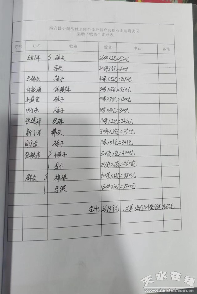 2023年12月18日23時59分,甘肅省臨夏州積石山縣發(fā)生6.2級地震,社會各界愛心單位和愛心人士紛紛通過天水市紅十字會向災(zāi)區(qū)一線伸出援手,獻(xiàn)出愛心。自2023年12月19日0時起至2024年1月5日24時本次募捐結(jié)束日止,天水市紅十字會累計接收社會各界捐贈款物共計1199986.05元,其中捐贈資金462067.05元,捐贈物資折價737919元。2024年1月1日至2024年1月5日,累計接收社會各界捐贈款物共計66596.02元,其中捐贈資金40457.02元(微信公眾號接收捐款合計金額1347.02元;銀行接收捐款合計金額39110元),接收市女企業(yè)家協(xié)會捐贈物資一批,折價26139元。
