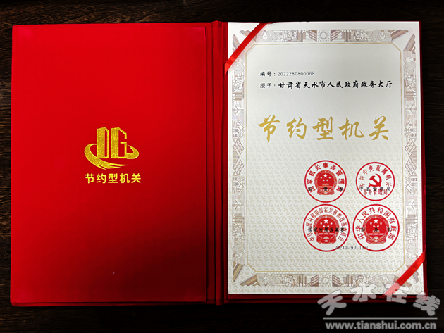 近日,天水市政務(wù)服務(wù)中心被國家機關(guān)事務(wù)管理局、中共中央直屬機關(guān)事務(wù)管理局、國家發(fā)展和改革委員會、財政部聯(lián)合授予“節(jié)約型機關(guān)”稱號。