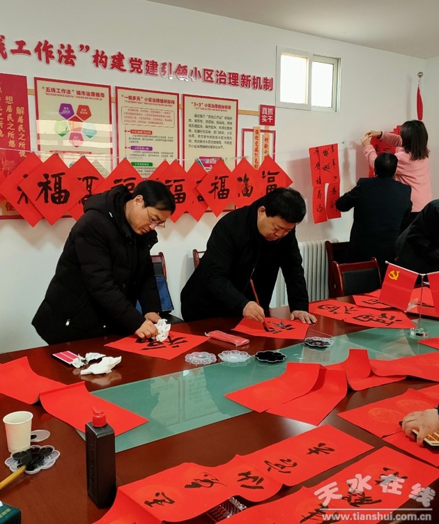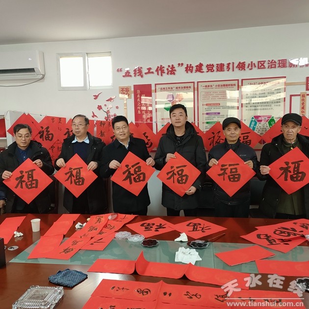 1月26日,市委直屬機關(guān)工委在結(jié)對共建社區(qū)秦州區(qū)岷山社區(qū)開展“送溫暖、送祝福、迎新春”慰問活動 。慰問社區(qū)困難黨員、老黨員5名,并邀請5位書法家現(xiàn)場書寫春聯(lián),為社區(qū)黨員和居民送去節(jié)日祝福。市委直屬機關(guān)工委書記溫建平出席活動,市委直屬機關(guān)工委領(lǐng)導(dǎo)班子成員和部分黨員干部、岷山社區(qū)離退休黨支部部分黨員和社區(qū)居民共100余人參加活動。
