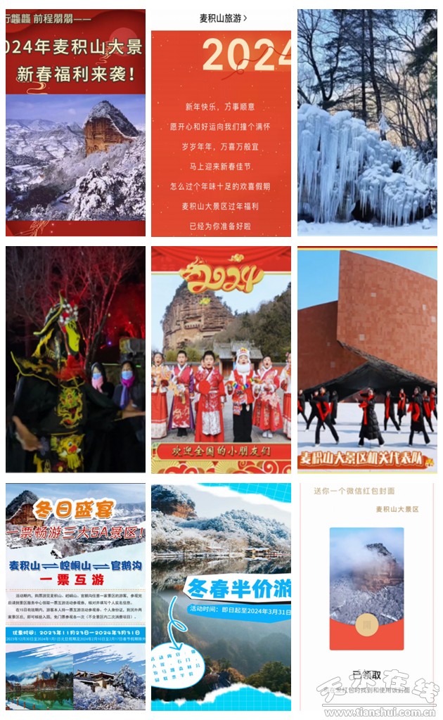 在做好游客良好出行體驗(yàn)保障措施的同時(shí),麥積山大景區(qū)著力營(yíng)造景區(qū)喜迎新春氛圍,通過(guò)抖音、微信等新媒體平臺(tái)開(kāi)展文化自然遺產(chǎn)保護(hù)、景區(qū)風(fēng)光、景區(qū)直播等主題宣傳活動(dòng),加大景區(qū)宣傳營(yíng)銷(xiāo)深度和廣度。發(fā)布了龍年新春系列宣傳視頻,以及1500個(gè)麥積山大景區(qū)紅包封面,為全國(guó)的網(wǎng)友送上麥積山的新年祝福,領(lǐng)略麥積山新年的文化魅力。節(jié)前,麥積山大景區(qū)推出一系列旅游惠民政策,投放“麥積山+溫泉”“麥積山+仙人崖”“麥積山+石門(mén)”特惠門(mén)票套餐,聯(lián)合隴東南優(yōu)勢(shì)景區(qū),推出“崆峒山、麥積山、官鵝溝冬春季一票互游活動(dòng)”。仙人崖景區(qū)、石門(mén)景區(qū)也啟動(dòng)了冬春全民半價(jià)游活動(dòng),設(shè)置了新春免費(fèi)開(kāi)放日,帶動(dòng)淡季旅游市場(chǎng)回暖。