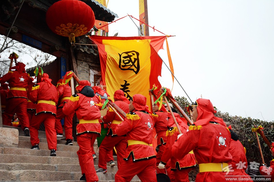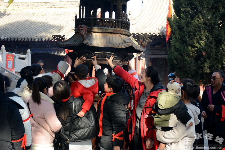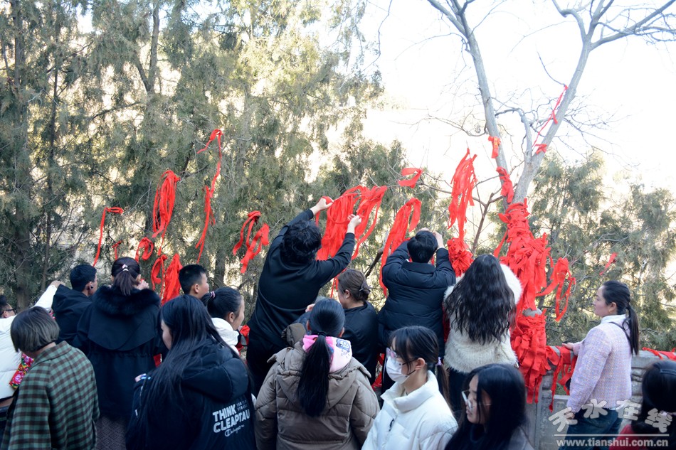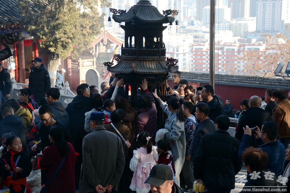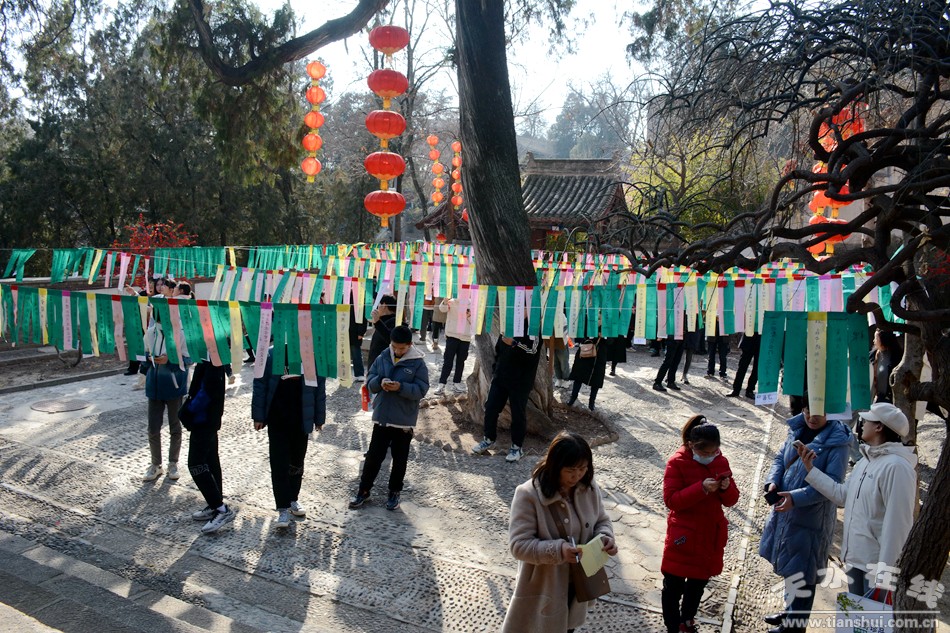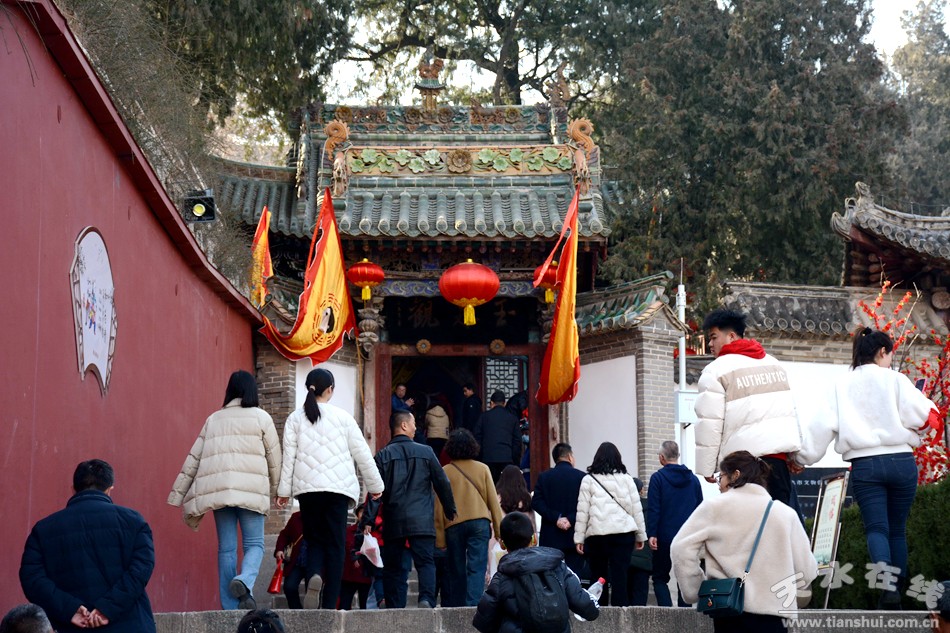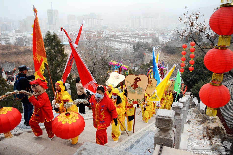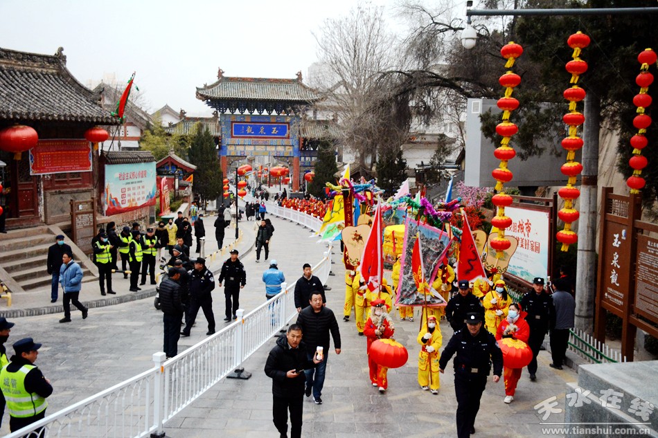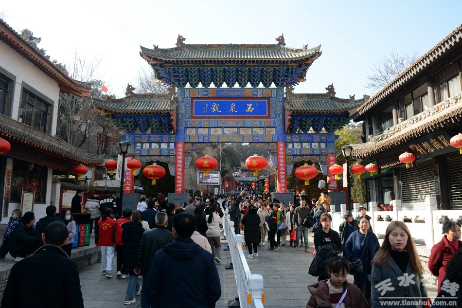 2月17日18日,農(nóng)歷正月初八初九,秦州區(qū)玉泉觀迎來一年一度的“朝觀”廟會。玉泉觀景區(qū)內(nèi)大紅燈籠高掛,數(shù)萬民眾扶老攜幼來到玉泉觀,綁紅繩、摸香爐,以祈福新的一年身體健康、全家幸福、國泰民安!吧暇懦^”是天水人約定俗成的古老風(fēng)俗,也是古城天水年俗文化活動的重要內(nèi)容之一,每年正月初八、初九都有數(shù)以萬計(jì)的民眾前來朝觀祈福。