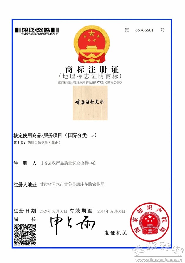 近日,由甘谷縣申報(bào)的“甘谷白條黨參”成功注冊(cè)國(guó)家地理標(biāo)志證明商標(biāo),商標(biāo)專有權(quán)有效期10年。