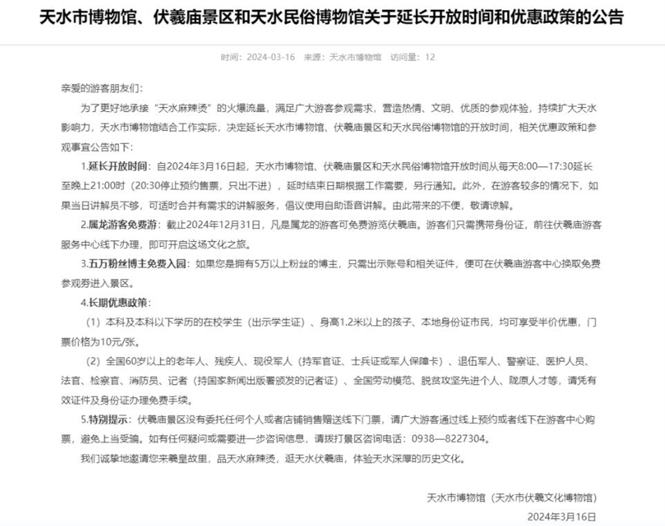 近日,隨著一碗麻辣燙火爆出圈,天水這座歷史名城瞬間登上熱搜,成為全國(guó)網(wǎng)紅打卡地。各地的寶寶們迅速行動(dòng),紛紛慕名趕往天水,品嘗熱辣滾燙的同時(shí),相約游覽旅游景點(diǎn)。與此同時(shí),為了迎接這波潑天富貴,天水市博物館上下齊心,主動(dòng)出擊,打破常規(guī),延長(zhǎng)接待時(shí)間,努力用精細(xì)化的優(yōu)質(zhì)服務(wù)迎接四海賓朋,以實(shí)際行動(dòng)踐行省市對(duì)旅游工作的安排部署。