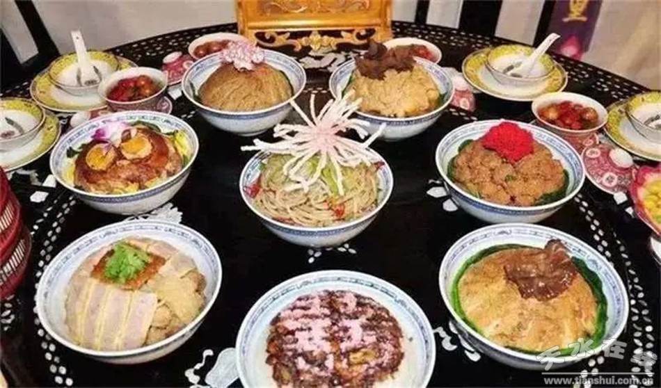 【天水八大碗】清朝乾隆期間“滿漢全席”在全國飲食行業(yè)得到發(fā)展!皾M漢全席”分為“上八珍”“中八珍”“下八珍”,其中八大碗被納為“下八珍”。天水“八大碗”包括:一碗里脊、一碗紅燒肉、一碗酥肉、―碗黃燜雞、一碗雜燴、一碗豆腐、一碗粉條、一碗八寶甜飯。