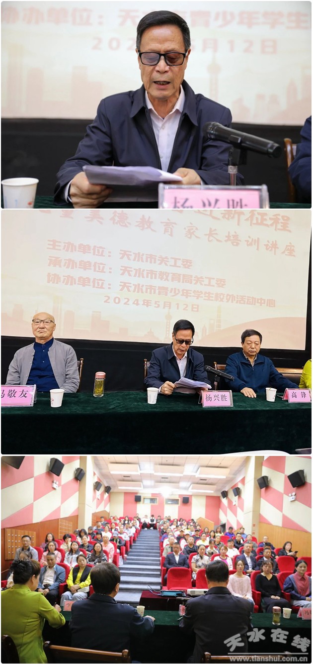 5月12日,由天水市關(guān)工委主辦、天水市教育局關(guān)工委承辦、天水市青少年學(xué)生校外活動(dòng)中心協(xié)辦的“禮贊新時(shí)代,奮進(jìn)新征程”天水市兒童美德教育家長(zhǎng)培訓(xùn)講座在市青少年學(xué)生校外活動(dòng)中心小禮堂進(jìn)行。市關(guān)工委學(xué)校委員會(huì)主任楊興勝,市關(guān)工委委員、天水市兒童美德教育宣講團(tuán)團(tuán)長(zhǎng)高鋒等出席活動(dòng),100多名家長(zhǎng)參加活動(dòng)。