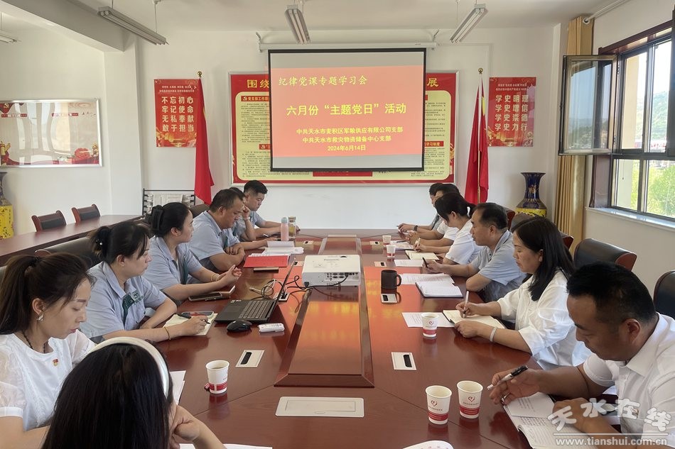 為深入學(xué)習(xí)貫徹習(xí)近平總書(shū)記關(guān)于黨紀(jì)學(xué)習(xí)教育的重要講話和重要指示精神,深入學(xué)習(xí)領(lǐng)會(huì)新修訂的《中國(guó)共產(chǎn)黨紀(jì)律處分條例》,推動(dòng)黨紀(jì)學(xué)習(xí)教育取得實(shí)實(shí)在在成效。6月14日,天水市救災(zāi)物資儲(chǔ)備中心黨支部、麥積區(qū)軍糧供應(yīng)有限公司黨支部聯(lián)合開(kāi)展了“主題黨日”活動(dòng)。共計(jì)15名黨員參加活動(dòng)。