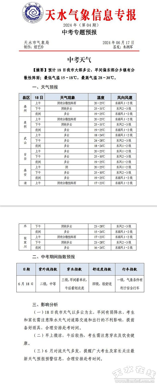 ·天水市氣象臺發(fā)布6月17日~6月23日天氣預報